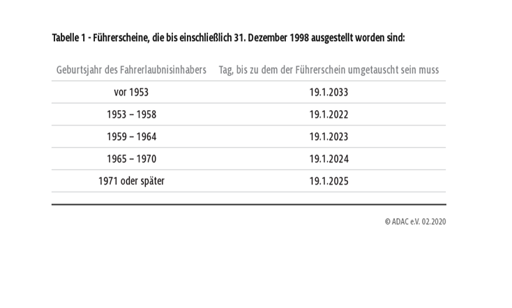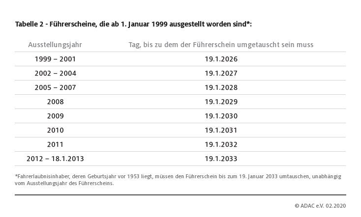 - Generell gilt: alle Führerscheine zwischen 1999 und 2013 müssen zwischen 2026 und 2033 erneuert werden.