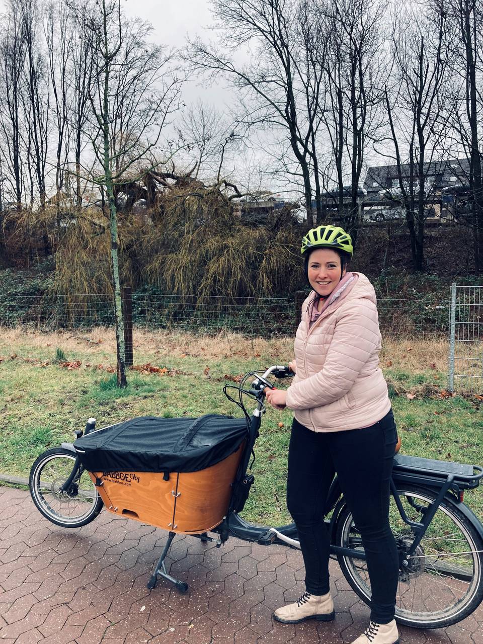 Melanie aus Datteln fährt gerne mit ihrem Lastenrad - mit Helm und achtet somit auf Sicherheit.